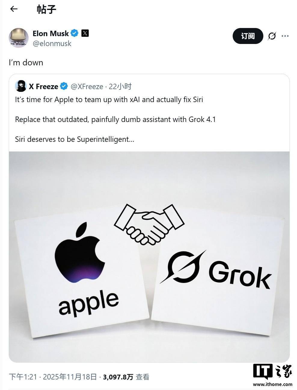 这一表态源于一名用户在X平台上发布的一条建议。该用户认为,当前版本的Siri已经“过时”,且“使用体验令人痛苦”,市场急需一款更智能的语音交互工具。他特别提到,xAI最新发布的Grok 4.1模型具备显著优势,建议用其替代Siri。