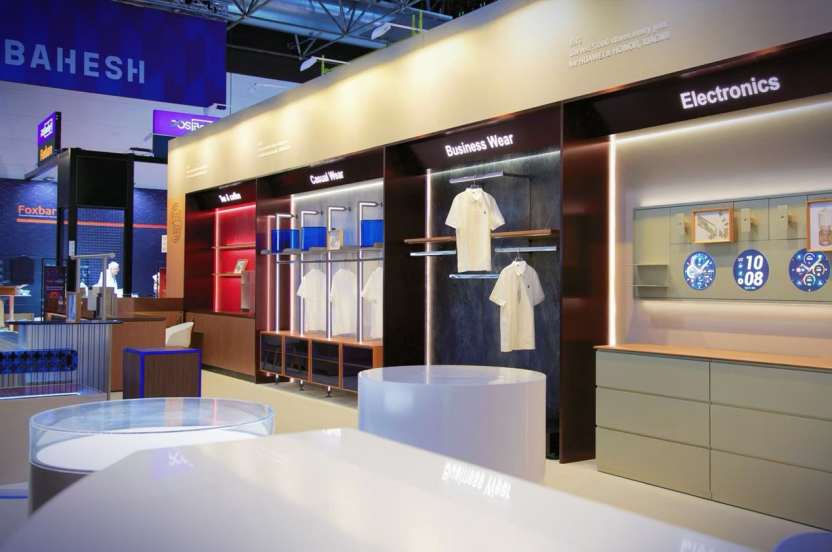 立足欧洲市场商业空间业务的实际需求,结合企业核心业务板块,百和仕在展会现场规划茶饮、服装(商务 & 休闲)、电子消费品三大实景化展区,以模块化还原空间布局,直观呈现了对全球品牌商业空间的深度理解,以及为客户创造价值的核心方向。这一设计思路与本届Euroshop 2026的体验化、场景化趋势高度契合,将品牌商业空间的功能需求与体验价值完美融合,成为展会中商业空间实景设计的优秀范本。